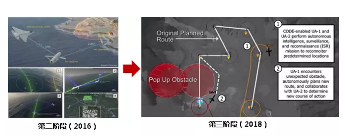 第三階段從2018年1月開始,測試使用6架真實無人機以及模擬飛機的協同能力,實現單人指揮無人機小組完成複雜任務。