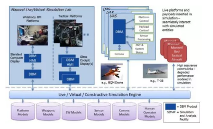 - 2018年1月,DARPA已向BAE系統公司授予DBM項目第三階段合同,前兩階段發展的成果能讓有人/無人機編組在幹擾環境中飛行,具備迴避威脅和攻擊目標的能力。圖3是DBM項目的能力驗證環境。