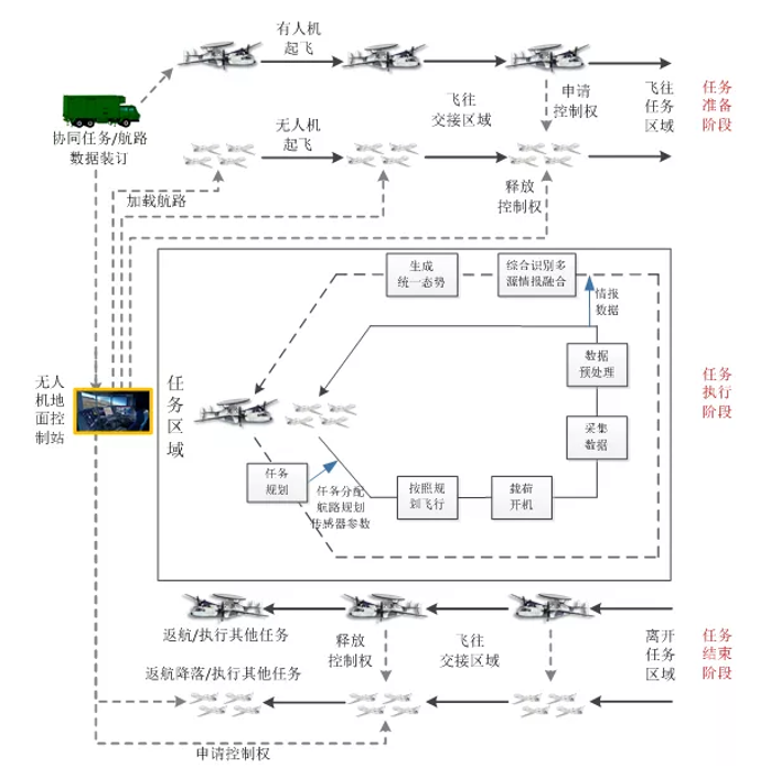有人機根據當前戰場態勢信息,分配各個無人機的作戰任務,並對無人機的航線和傳感器進行規劃。無人機在有人機的指揮下,按照規劃結果執行飛行任務,抵達目標區域後,傳感器開機。有人機上的操作人員對無人機傳感器進行控制,無人機負責採集並回傳目標情報至有人機。通過多源情報綜合處理,形成新的態勢信息,爲有人機的進一步決策提供依據。